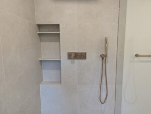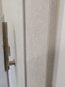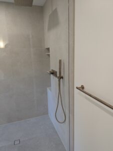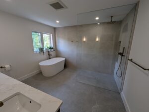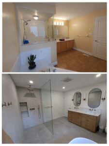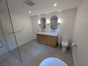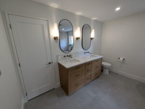 Here, we executed a complete overhaul of the existing ensuite bathroom. The door was moved from the middle of the bathroom wall to the corner, a much more practical location. Then the vanity was moved next to the new door location. We flipped the orientation of the toilet, making it much more useable and less out of place. We eliminated the old, outdated jacuzzi tub and installed a beautiful new freestanding tub with floor-mounted tub spout. Next to this, we built a curbless, doorless walk-in shower with a single pane of floor to ceiling clear glass. All new electrical, including dimmable potlights, wall-mounted sconces, dimmer switches on all lighting, and a timer switch for the fan were included. To spare no details, we upgraded the exhaust fan to a high CFM fan, complete with new 6″ ductwork exhausting through the roof and to the exterior. Needless to say, the clients were thrilled with the finished product!