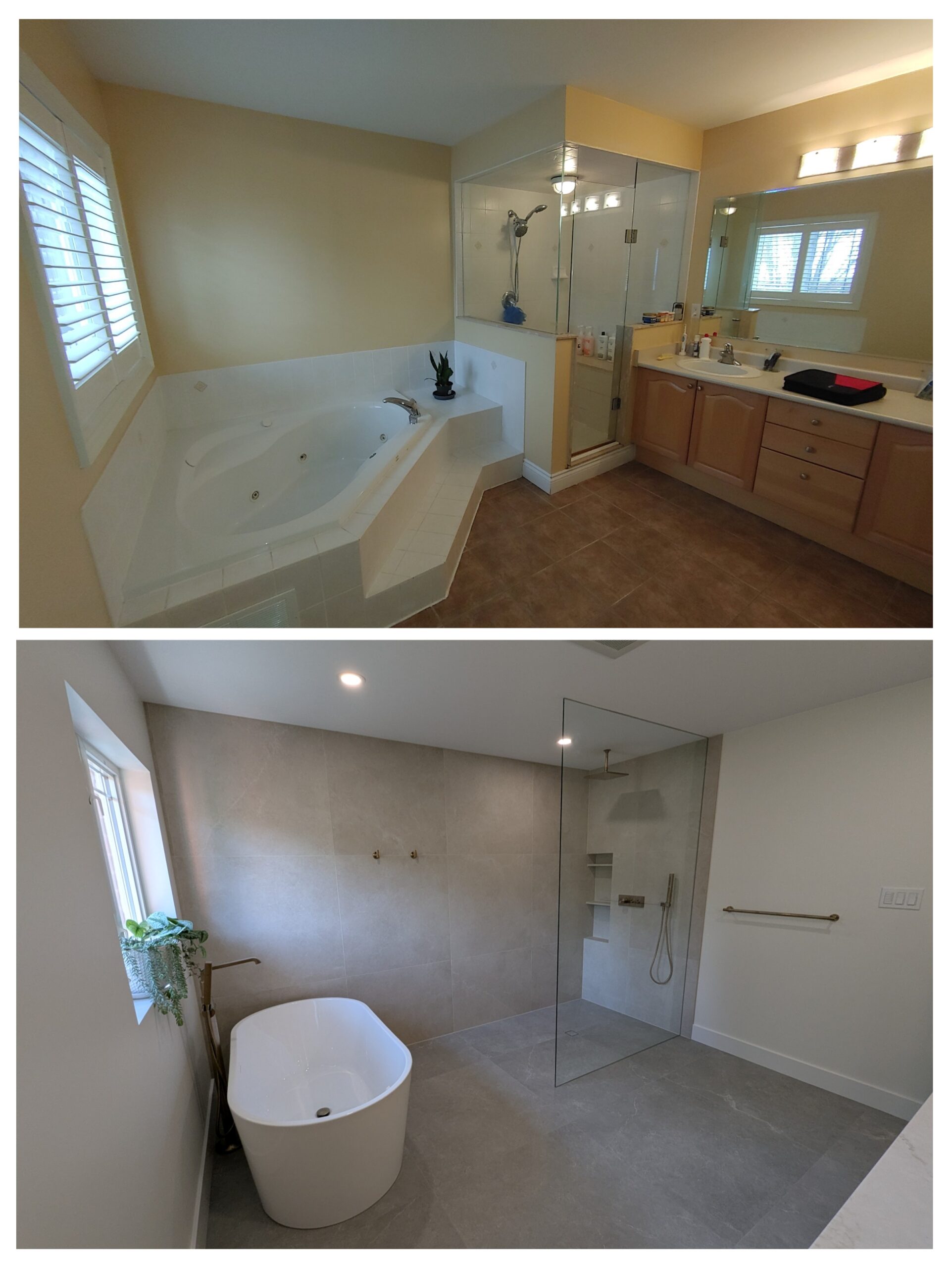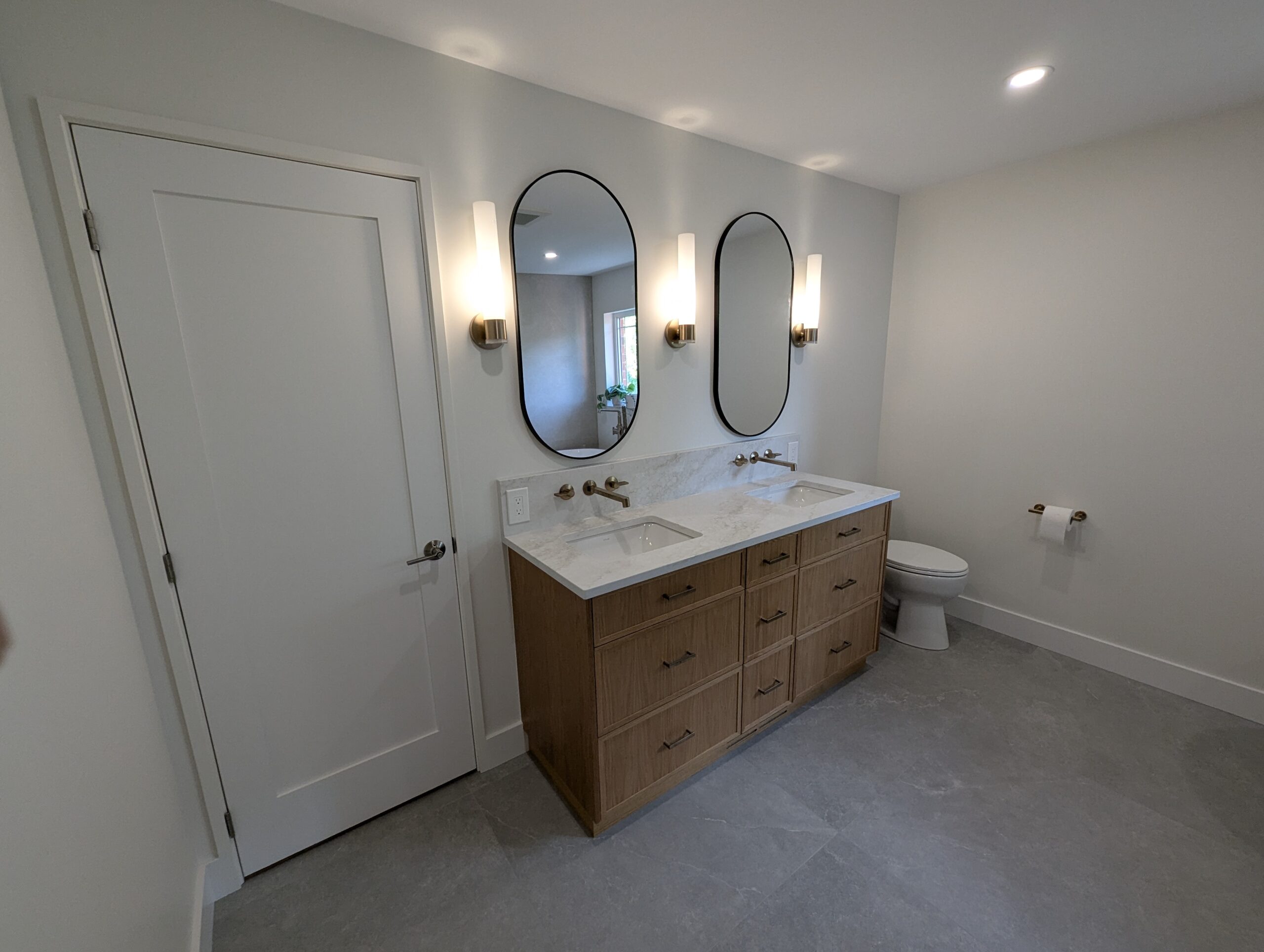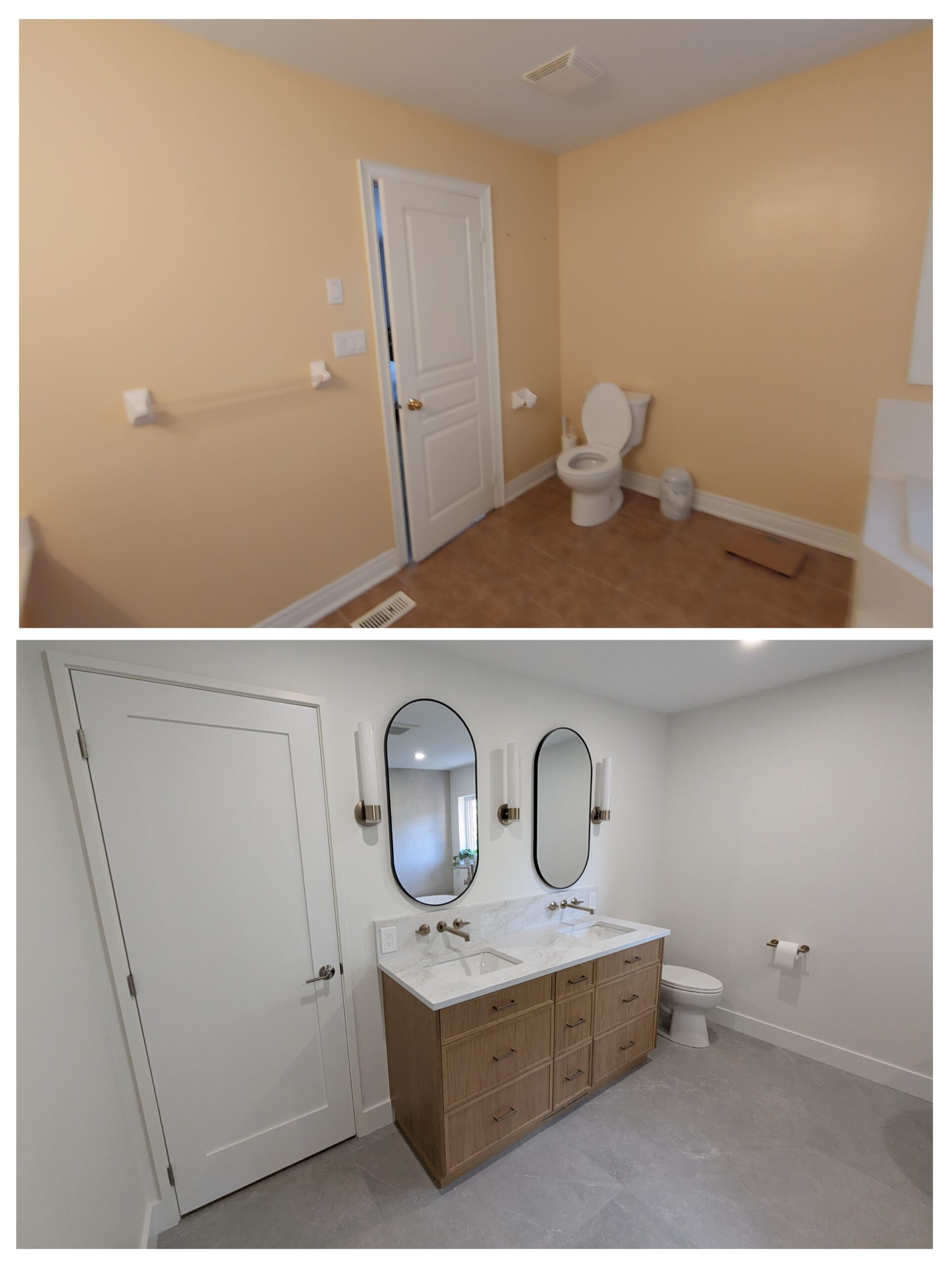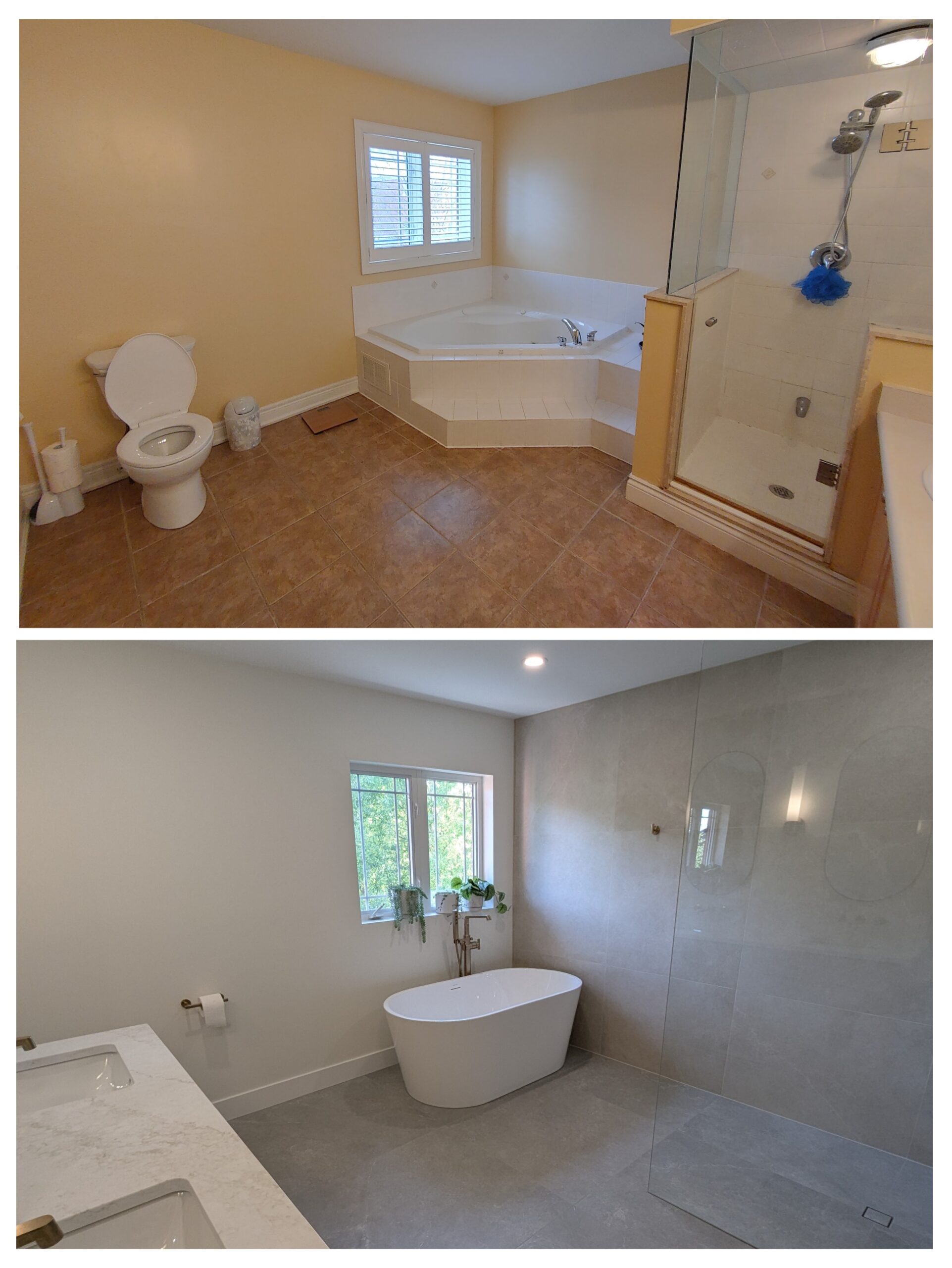 Here, we executed a complete overhaul of the existing ensuite bathroom. The door was moved from the middle of the bathroom wall to the corner, a much more practical location. Then the vanity was moved next to the new door location. We flipped the orientation of the toilet, making it much more useable and less out of place. We eliminated the old, outdated jacuzzi tub and installed a beautiful new freestanding tub with floor-mounted tub spout. Next to this, we built a curbless, doorless walk-in shower with a single pane of floor to ceiling clear glass. All new electrical, including dimmable potlights, wall-mounted sconces, dimmer switches on all lighting, and a timer switch for the fan were included. To spare no details, we upgraded the exhaust fan to a high CFM fan, complete with new 6″ ductwork exhausting through the roof and to the exterior. Needless to say, the clients were thrilled with the finished product!