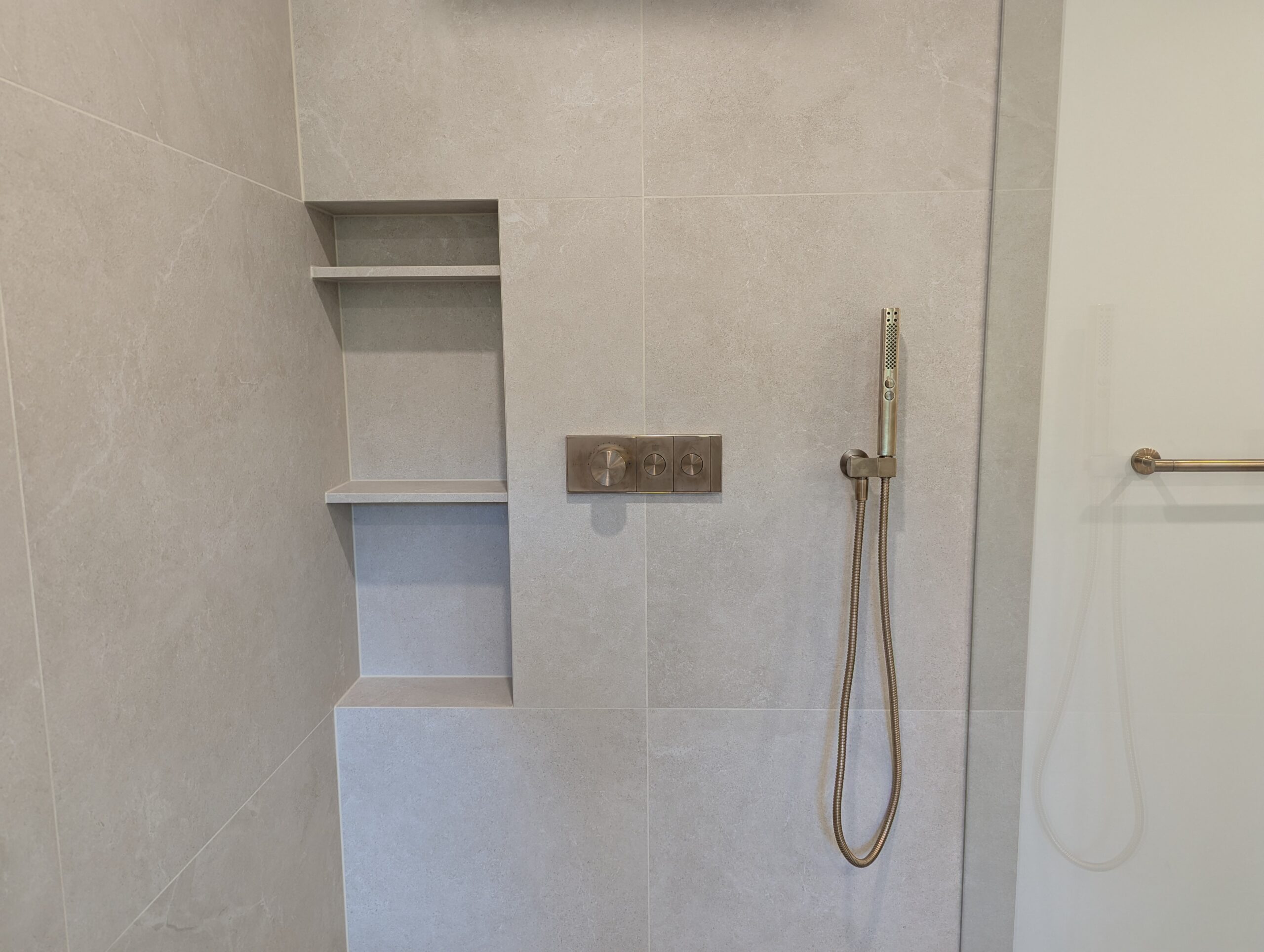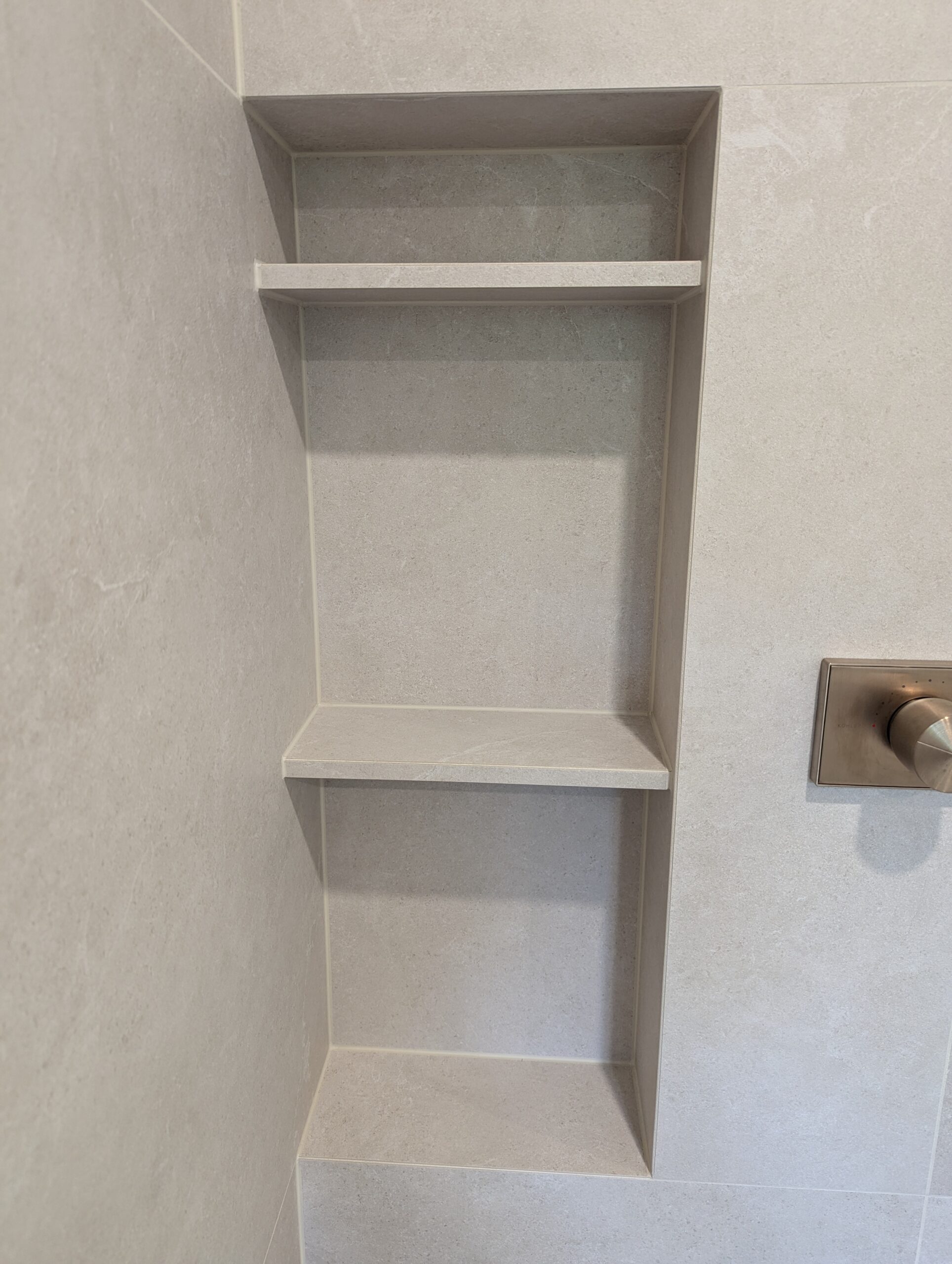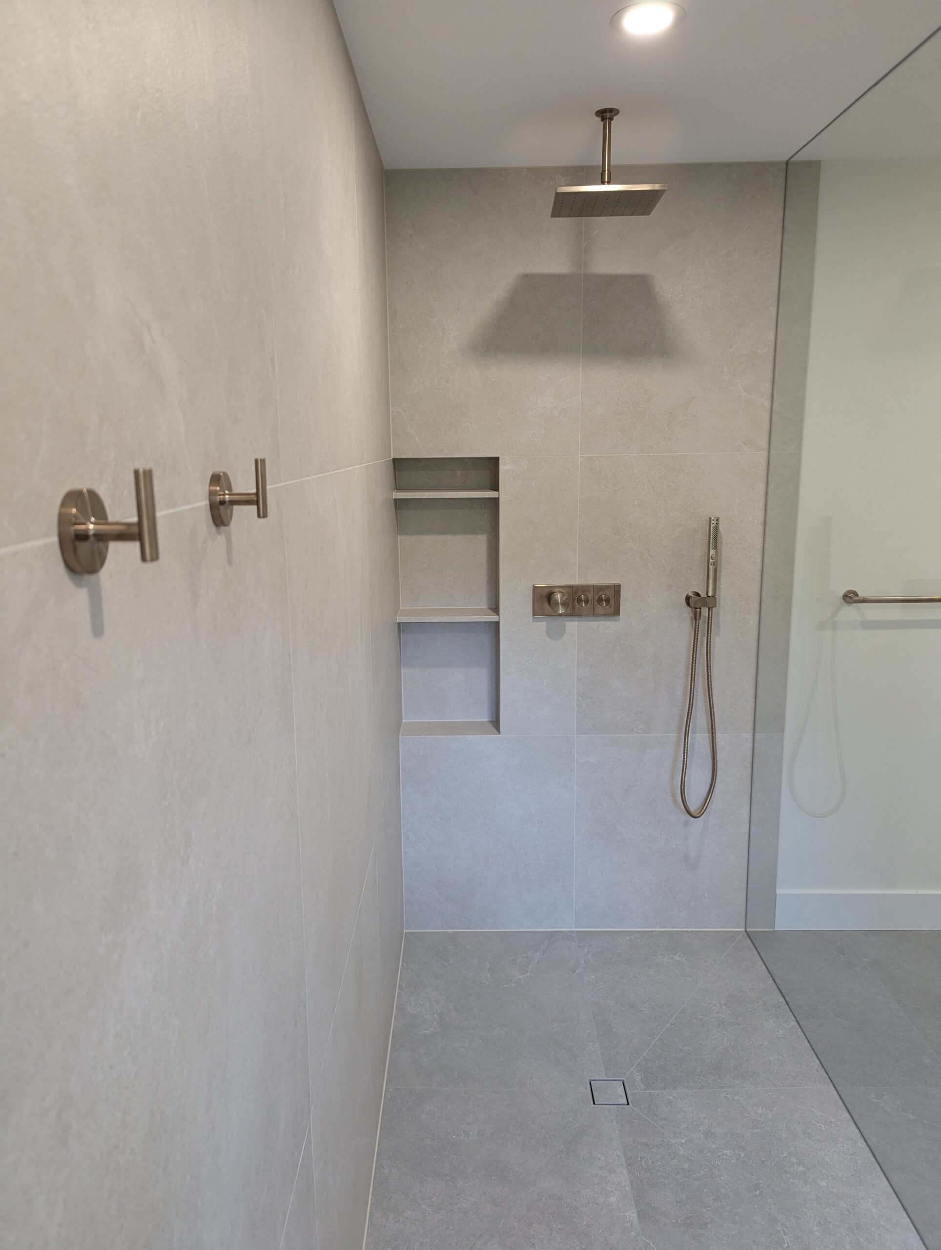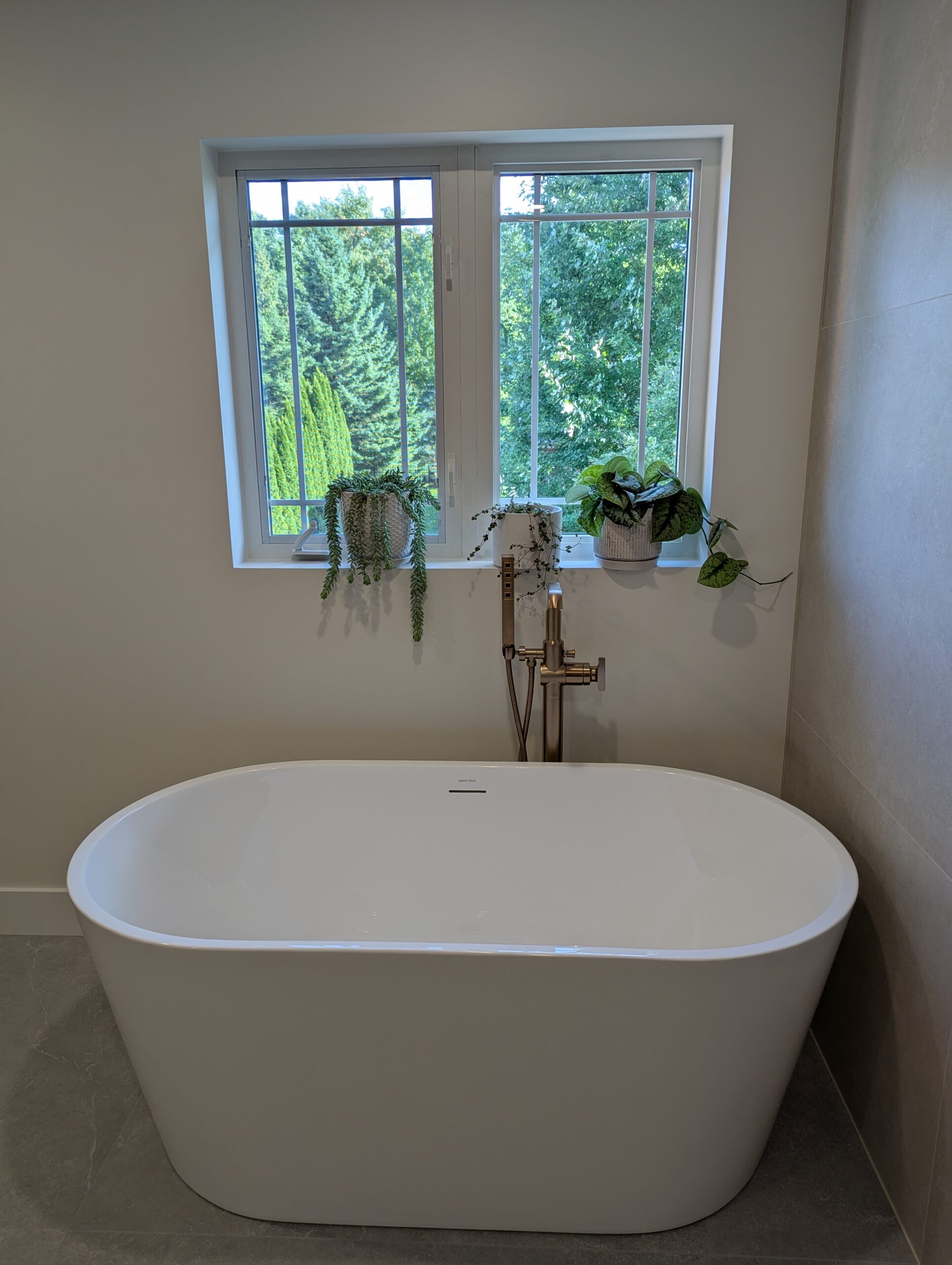Here, we executed a complete overhaul of the existing ensuite bathroom. The door was moved from the middle of the bathroom wall to the corner, a much more practical location. Then the vanity was moved next to the new door location. We flipped the orientation of the toilet, making it much more useable and less out of place. We eliminated the old, outdated jacuzzi tub and installed a beautiful new freestanding tub with floor-mounted tub spout. Next to this, we built a curbless, doorless walk-in shower with a single pane of floor to ceiling clear glass. All new electrical, including dimmable potlights, wall-mounted sconces, dimmer switches on all lighting, and a timer switch for the fan were included. To spare no details, we upgraded the exhaust fan to a high CFM fan, complete with new 6″ ductwork exhausting through the roof and to the exterior. Needless to say, the clients were thrilled with the finished product!