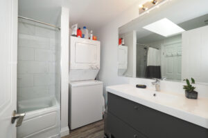 In the upper level bathroom, we eliminated a dead corner space and used it to add room for second floor laundry. Then we redid the shower with new tile, updated the vanity with an Ikea wall hung vanity, installed new flooring and a new toilet.