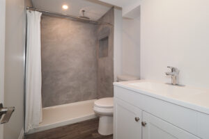 In the basement, we eliminated the existing laundry connections and converted that area into a wetbar, and increased the size of the bathroom to have a full 5′ wide shower with built-in shower niche, toilet, and vanity.