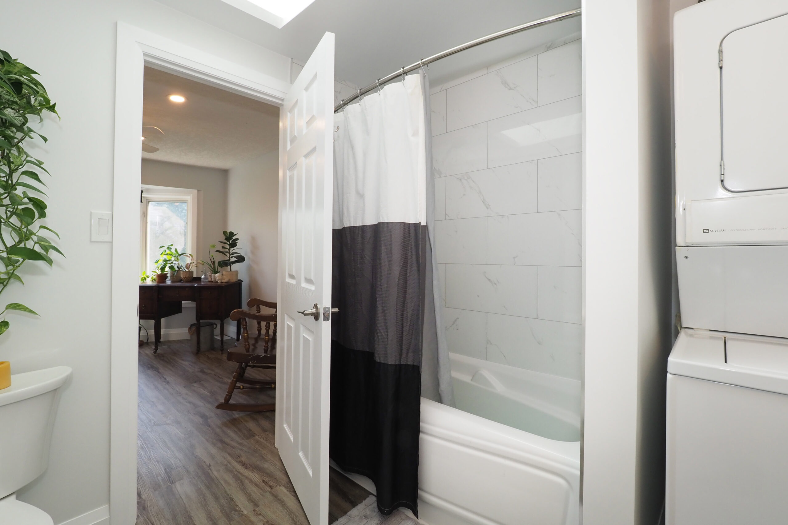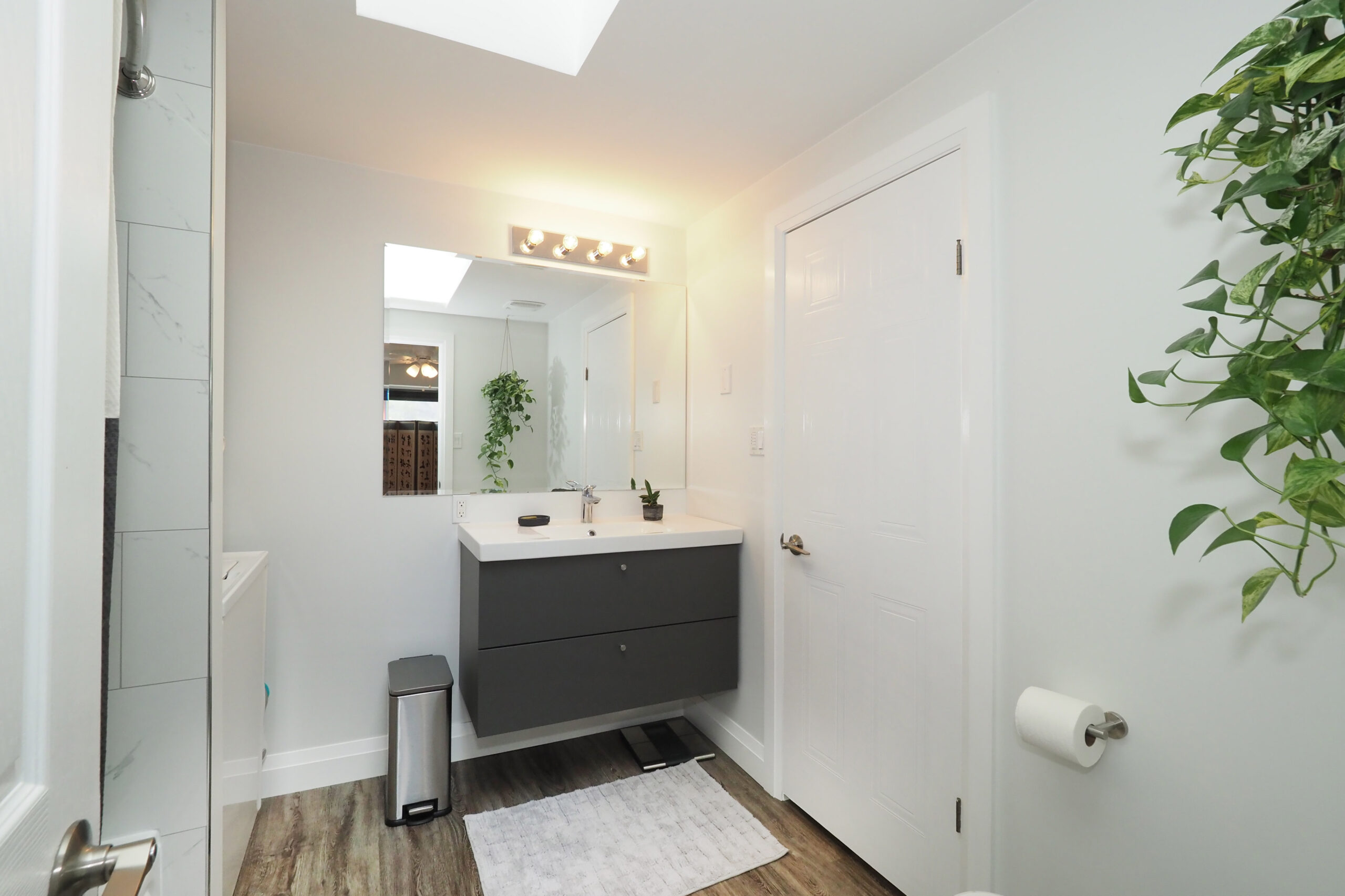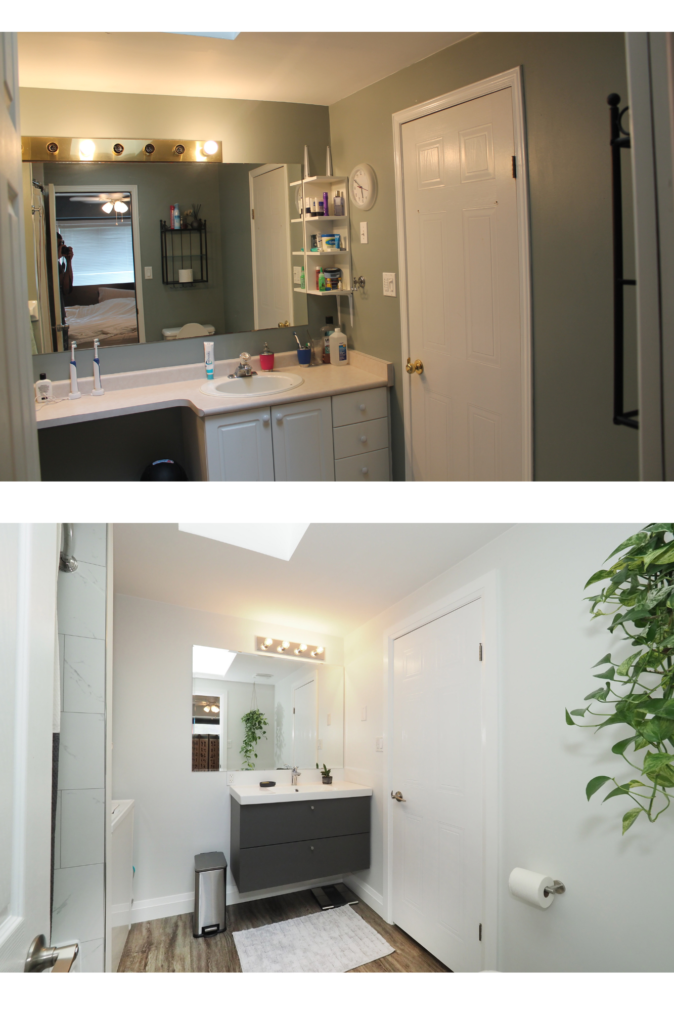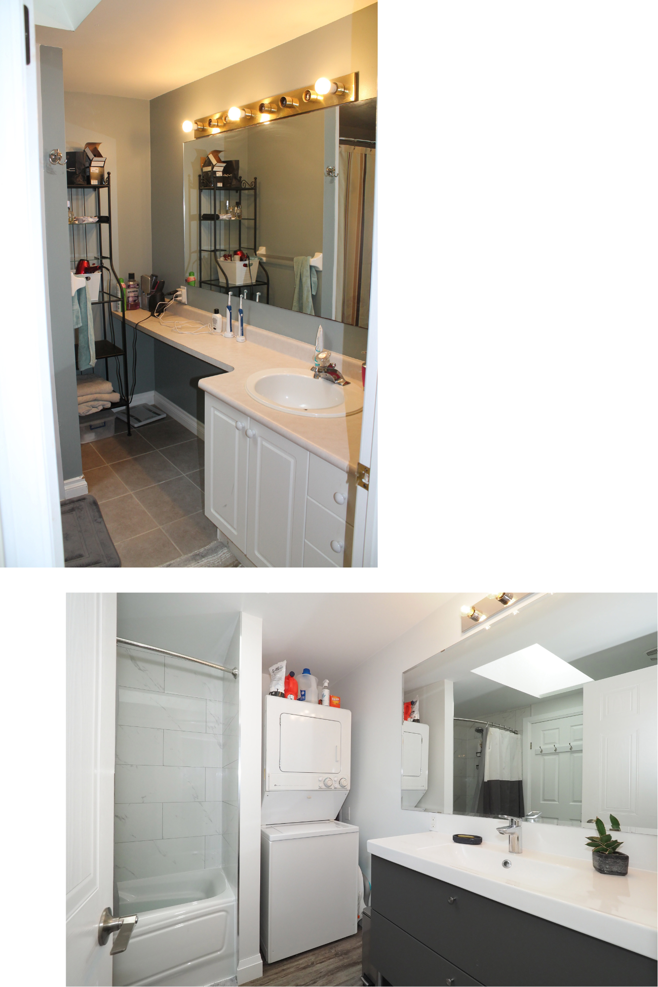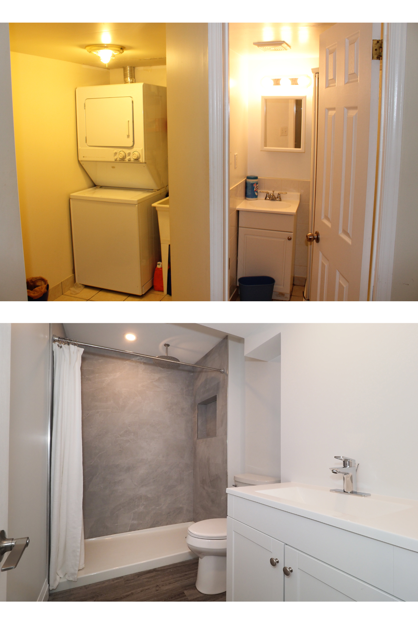 In the upper level bathroom, we eliminated a dead corner space and used it to add room for second floor laundry. Then we redid the shower with new tile, updated the vanity with an Ikea wall hung vanity, installed new flooring and a new toilet.