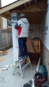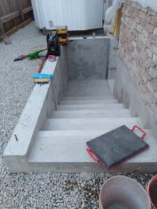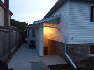 At this duplex conversion, we added a separate walkout basement entrance into the lower level unit. The area was excavated, drainage added, concrete stairs poured, then a concrete walkway was poured around that. Finally, we built walls and a roof over the walkout area to protect it from the elements.
