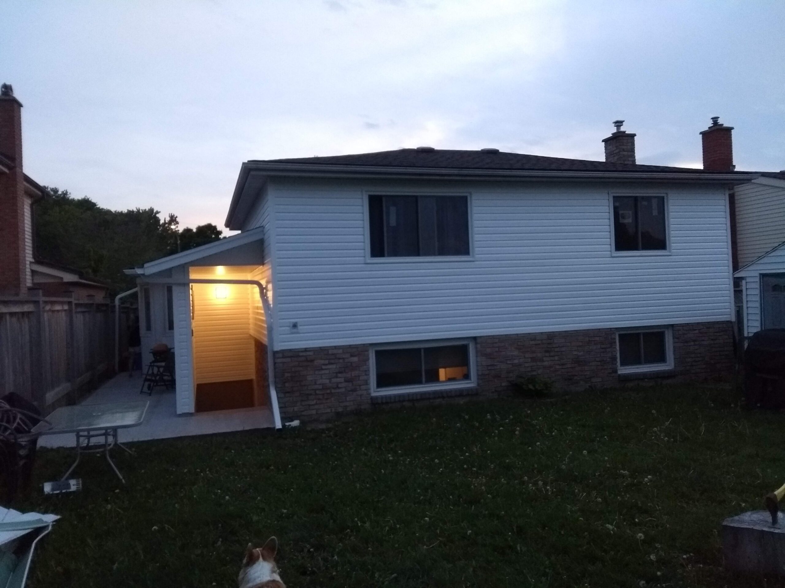 At this duplex conversion, we added a separate walkout basement entrance into the lower level unit. The area was excavated, drainage added, concrete stairs poured, then a concrete walkway was poured around that. Finally, we built walls and a roof over the walkout area to protect it from the elements.