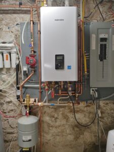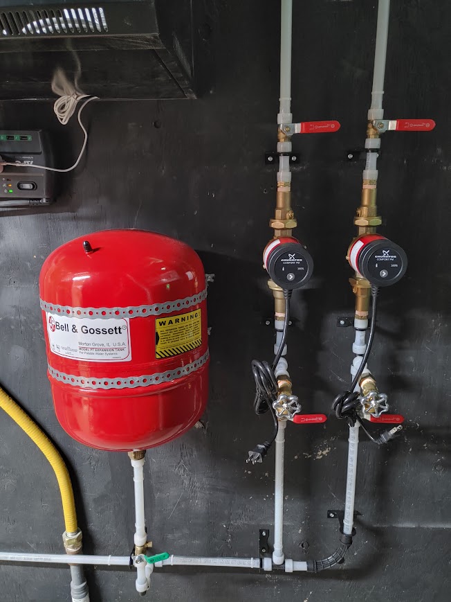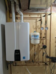 Navien tankless hot water heater installation with double recirculation line and expansion tank
